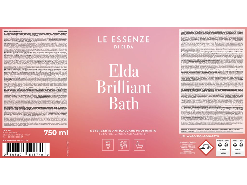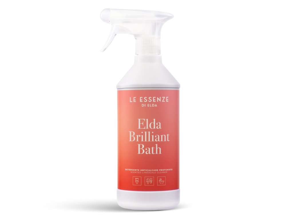 ELDA BRILLIANT BATH 750 ml - curățitor parfumat cu parfum proaspăt pentru îndepărtarea calcarului din chiuvete, baterii, echipamente sanitare, cabine de duș, căzi, faianță, gresie, ceramică, porțelan, suprafețe din inox și smălțuite.