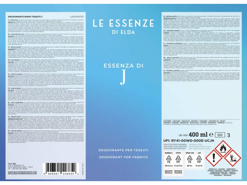 Spray pentru rufe și garderobă ESSENZA J 400ml - Aromă dulce cu notă lemnoasă și mosc.