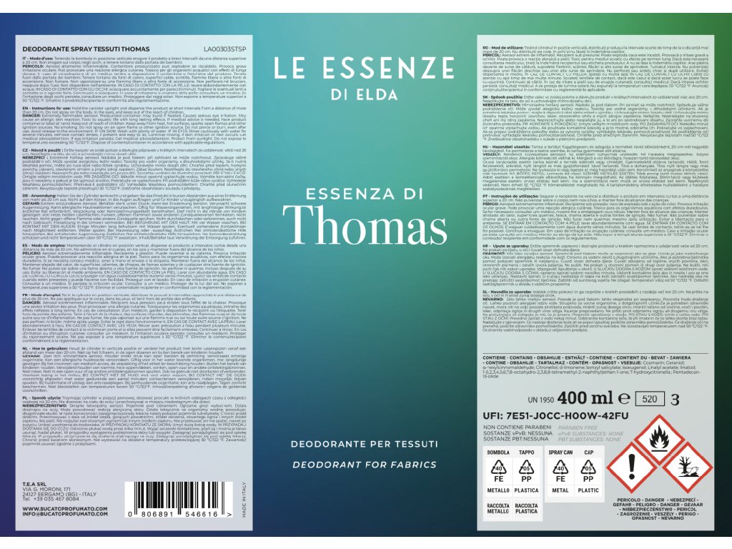Spray pentru rufe și garderobă THOMAS 400ml - Aromă florală pudrată cu note de mosc și vanilie.